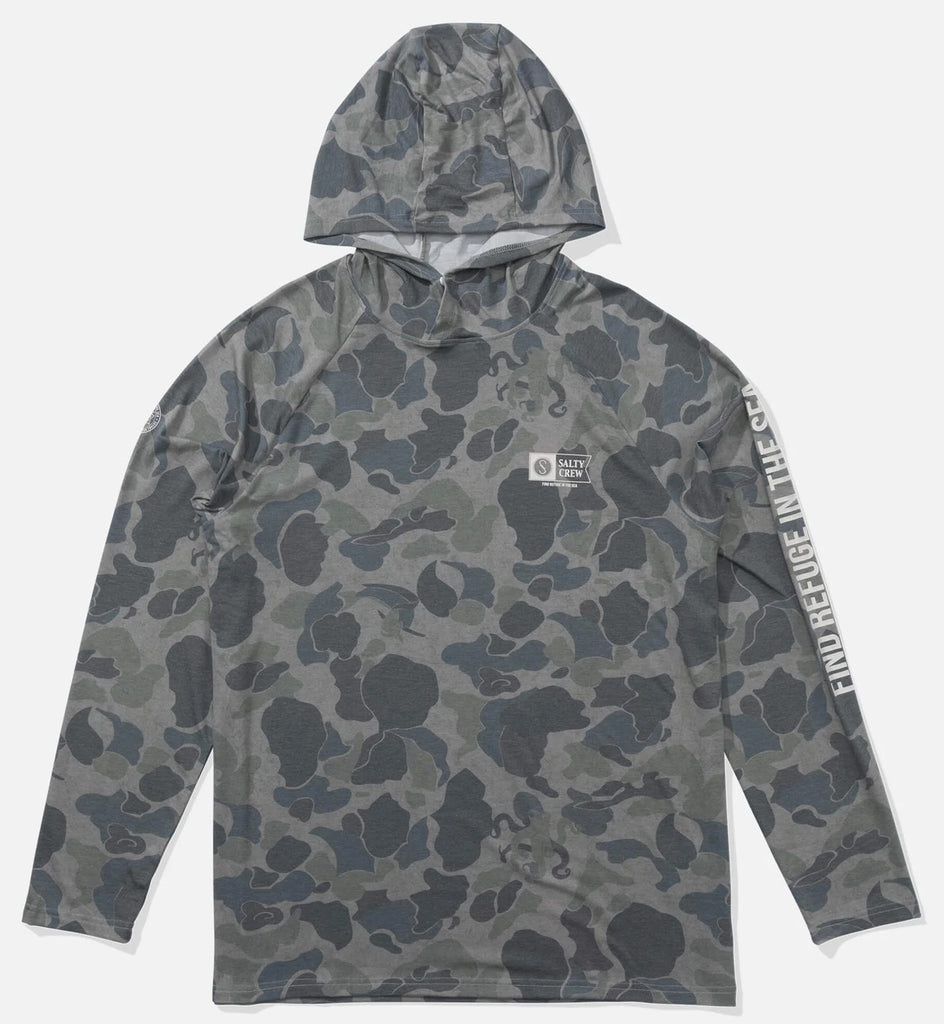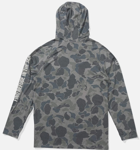 The Mariner Hood Tech Tee in Sand Camo combines performance and sustainability with its 60% recycled polyester blend, enhanced by viscose and elastane for superior comfort and stretch. Offering UPF 50+ protection, this lightweight fabric shields you from the sun while its moisture-wicking properties keep you dry during active days.